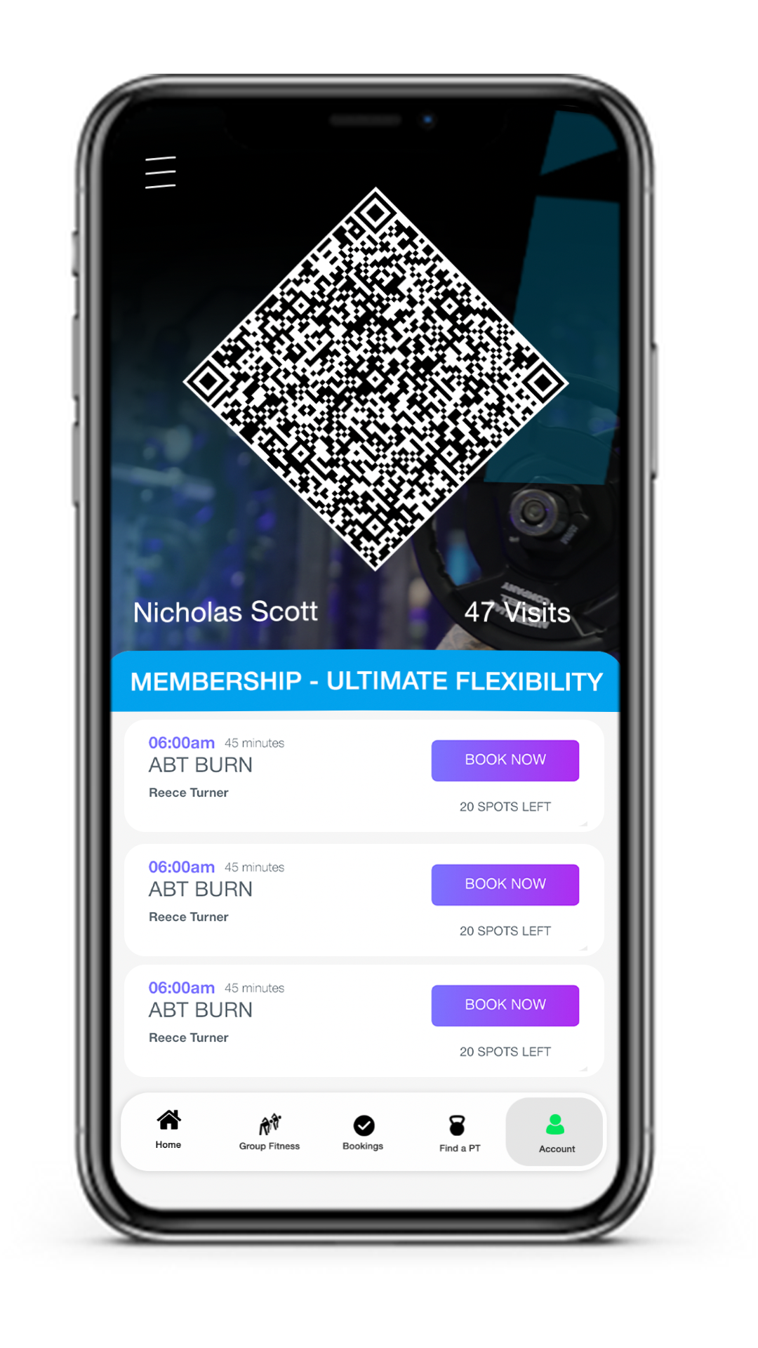 At the front of our facilities, you will see a Gymetrix reader. Line the red dot to the centre of the QR code on the screen.
